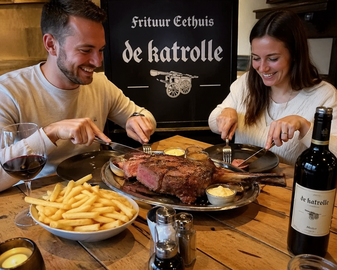 Geniet samen van een heerlijke Côte à l’os voor 2 personen, perfect bereid en geserveerd in ons uniek en sfeervol kader. Laat je verrassen door een sappig stuk kwaliteitsvlees, gecombineerd met onze dagverse, goudgebakken frietjes en een fles heerlijke rode wijn om het geheel compleet te maken.