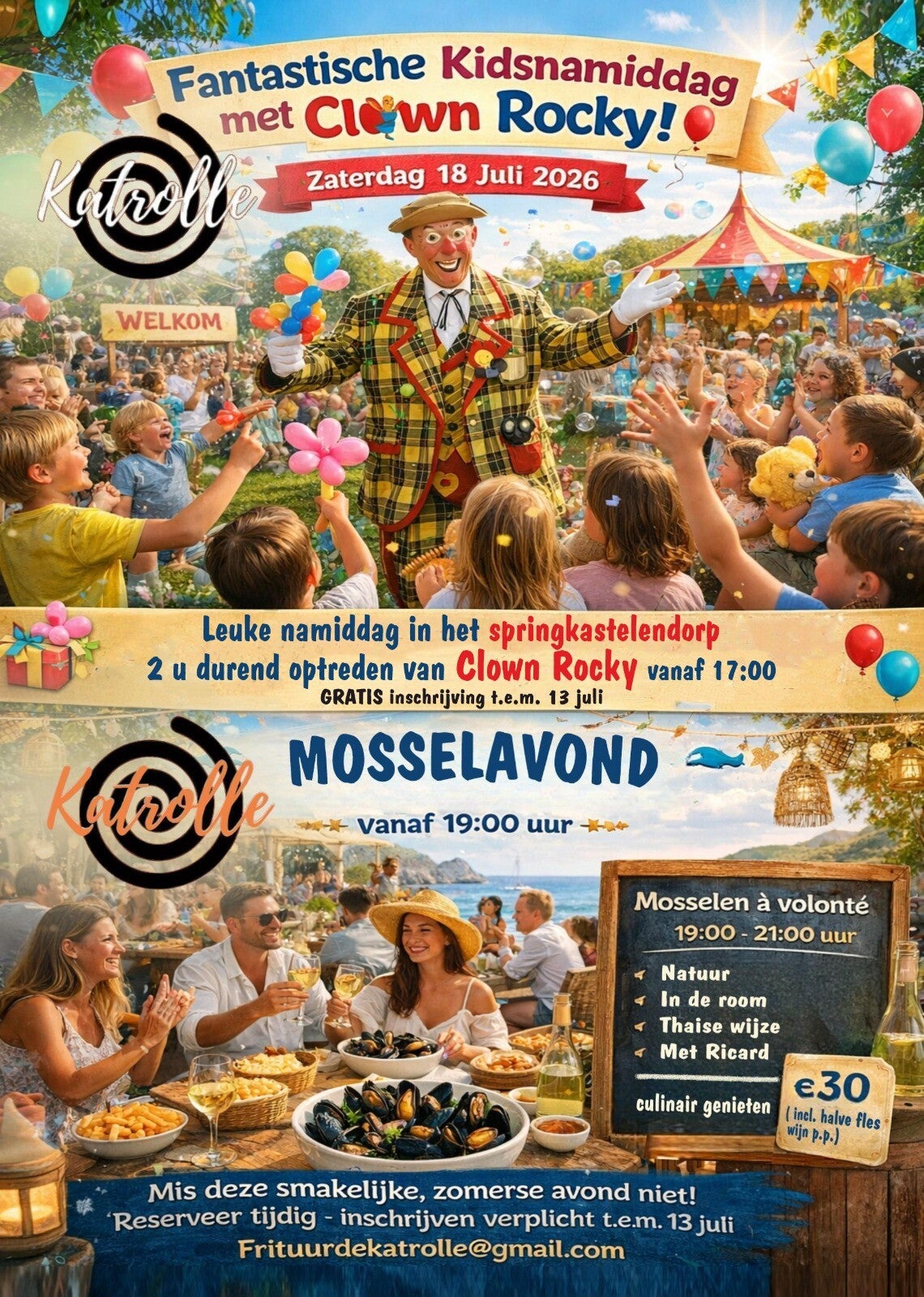 π© Reserveren is noodzakelijk en kan tot maandag 27 Juli 2026 via Frituurdekatrolle@gmail.com